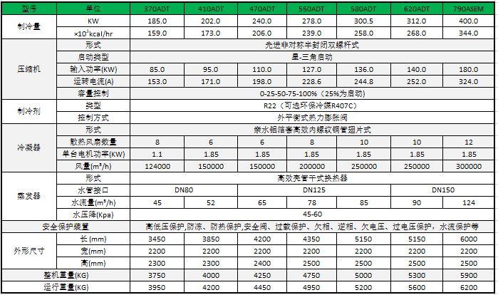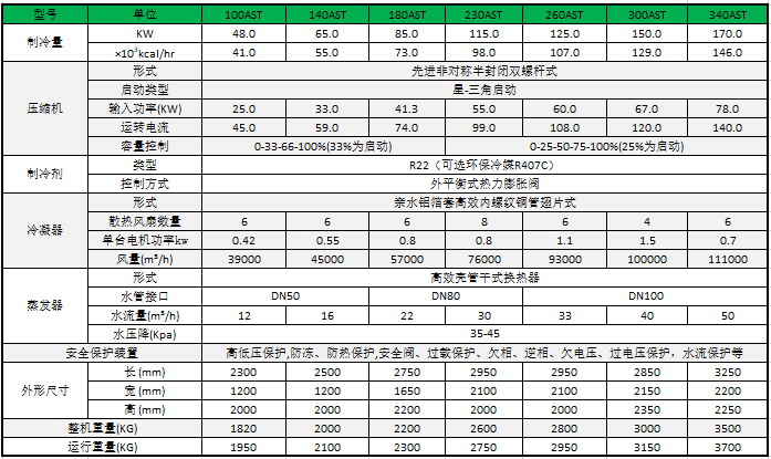 1.上表制冷工況:冷水進水溫度-0℃,冷水出水溫度-5℃,環(huán)境溫度35℃;